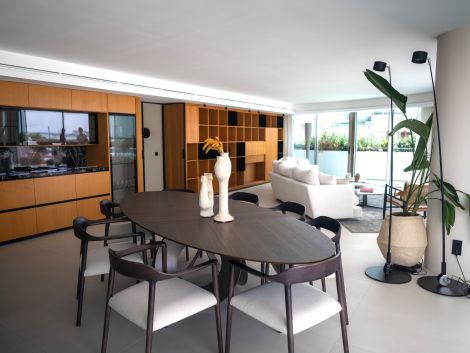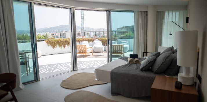 Ocupando la última planta, el ático presume de un diseño diáfano y fluido. La cocina, totalmente equipada, se abre a un elegante salón con puertas correderas de cristal que dan acceso a una terraza envolvente. La residencia incluye tres dormitorios dobles con baño en suite, una despensa y un patio interno que conduce a una terraza privada en la azotea con vistas de 360°, incluyendo Dalt Vila y la marina. Desde la terraza, los residentes disfrutan de acceso privado a la piscina de la azotea y a una zona de descanso exclusiva.