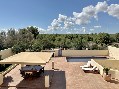 The property features a big garden with a large swimming pool, an outdoor kitchen, and open views over the surrounding landscape. This open view gives a quiet and spacious feel, even though the house is located in the centre of the village.
