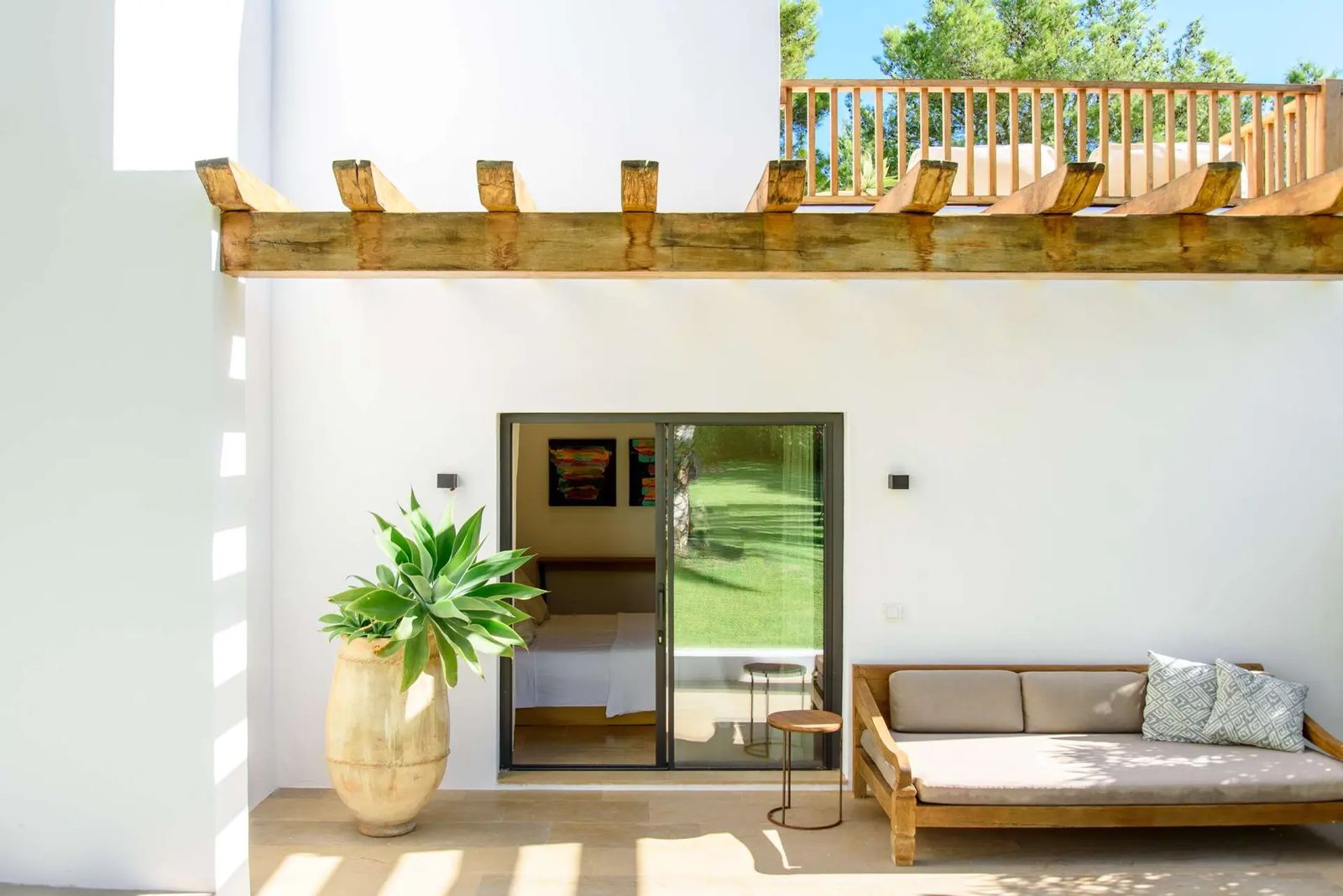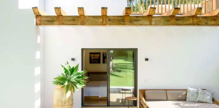 Located next to the pool, it offers three additional en-suite bedrooms. Two are situated on the ground floor with direct access to the terrace, while the third is on the upper floor and includes a private fridge and balcony.