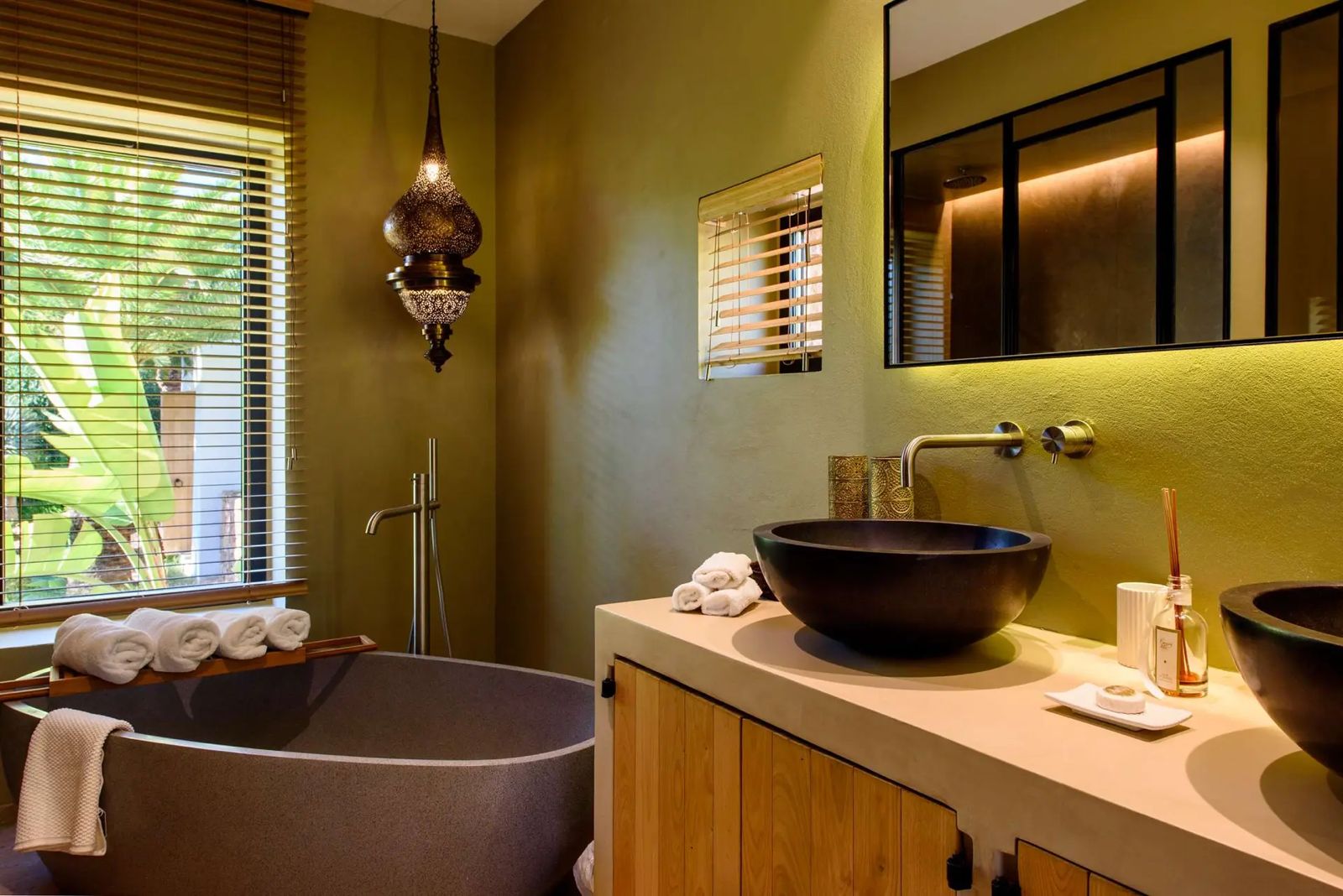 The 3,000 m² landscaped gardens feature palm trees, elegant corten steel pathways, and complete privacy. At the heart of the property lies a 10 x 5 metre swimming pool, optionally heated, surrounded by luxury sun loungers and a pergola designed for alfresco dining. The outdoor areas also include a fully equipped kitchen with BBQ and a rooftop lounge connected to the master suite, offering panoramic views over the valley.