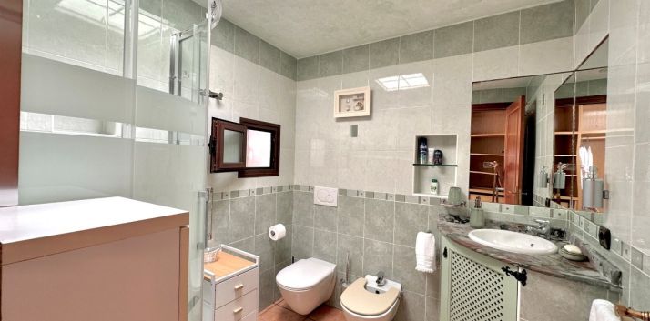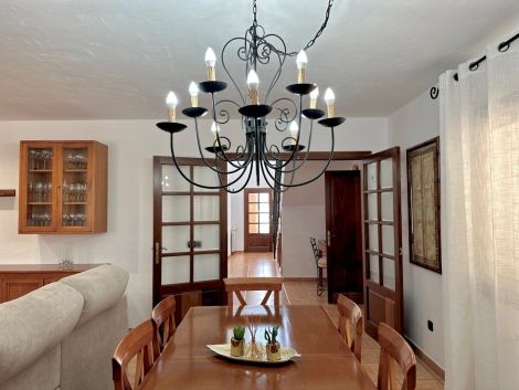 La casa cuenta con cuatro dormitorios y tres baños. La cocina está conectada con el salón, lo que crea una distribución funcional. También hay un anexo que se puede utilizar para invitados o personal.