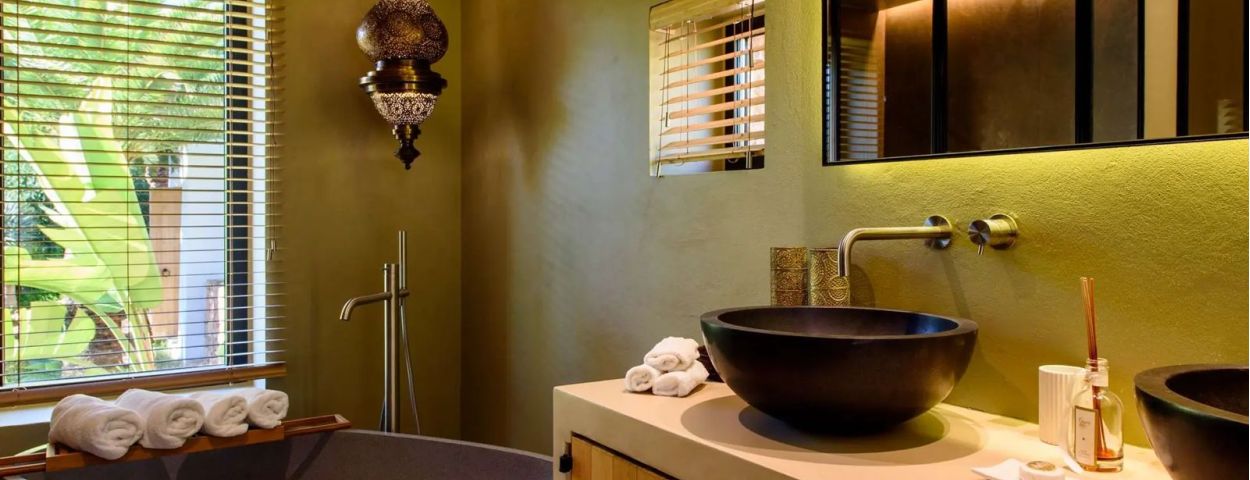 The 3,000 m² landscaped gardens feature palm trees, elegant corten steel pathways, and complete privacy. At the heart of the property lies a 10 x 5 metre swimming pool, optionally heated, surrounded by luxury sun loungers and a pergola designed for alfresco dining. The outdoor areas also include a fully equipped kitchen with BBQ and a rooftop lounge connected to the master suite, offering panoramic views over the valley.